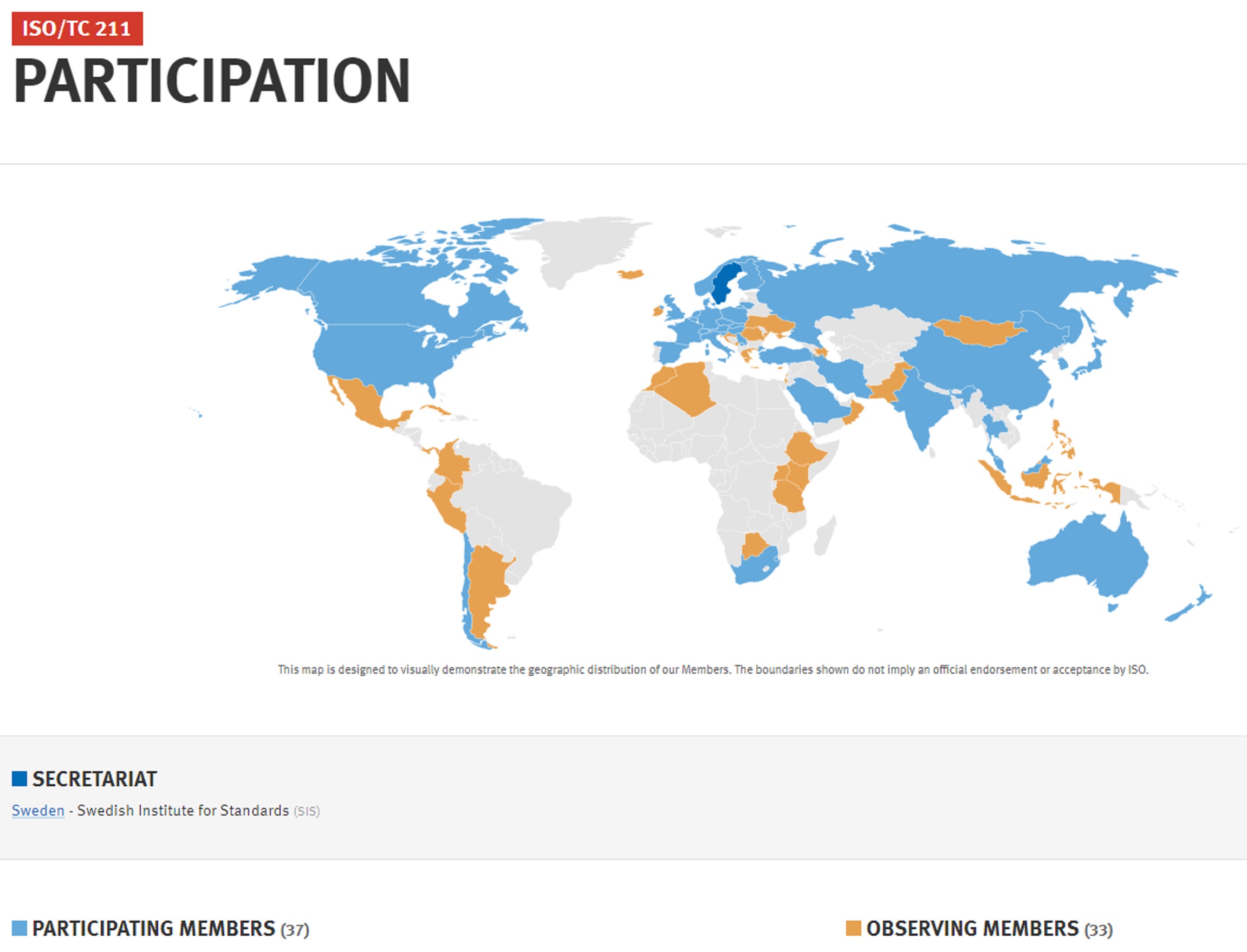 The Swedish Standards Institute for Standards is the Global Secretariat for ISO TC/211 which leads standardization in the field of digital geographic information. Standardization titles developed by this committee aims to establish a structured set of standards for information concerning objects or phenomena that are directly or indirectly associated with a location relative to the Earth. These standards may specify, for geographic information, methods, tools and services for data management (including definition and description), acquiring, processing, analyzing, accessing, presenting and transferring such data in digital / electronic form between different users, systems and locations.