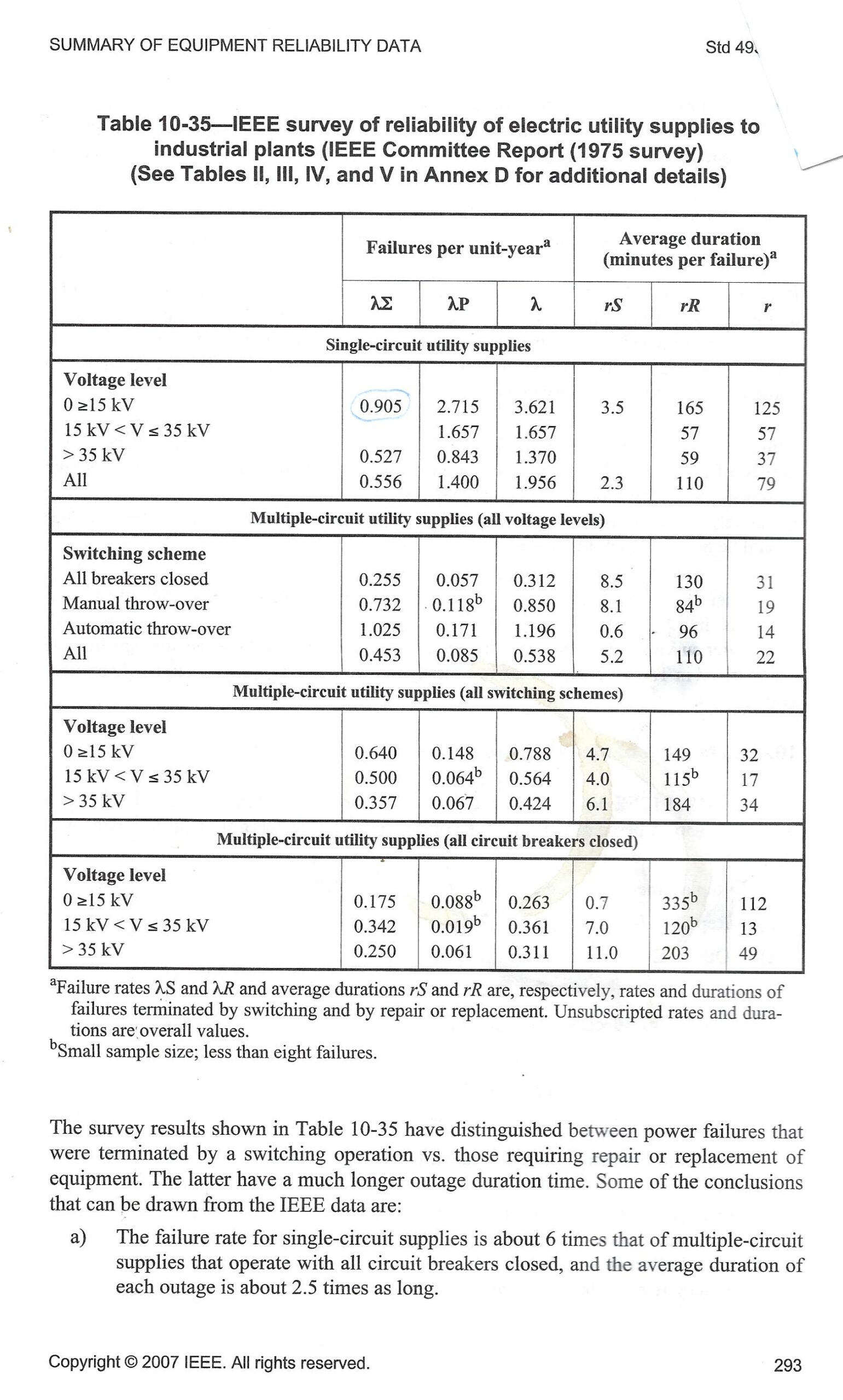 This table is based upon a ~50 item data set reported in a 1975 paper which roughly coincides with the first IEEE reliability metrics we now know as SAIDI, MAIFI, CAIFI etc. It has served the industry well — and still may in its present form — but due diligence requires application of current gathering techniques and respect for the distribution reliability data that is now available.